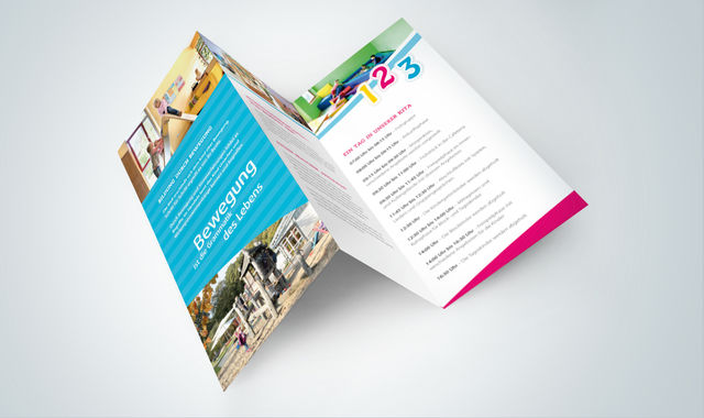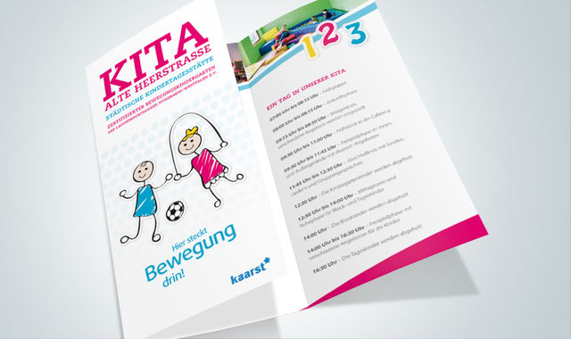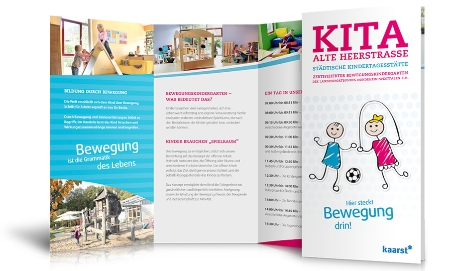 Für die Kita Alte Heerstraße in Kaarst hat uniacreation einen frischen und modernen 6-seitigen Wickelfalz-Flyer realisiert.